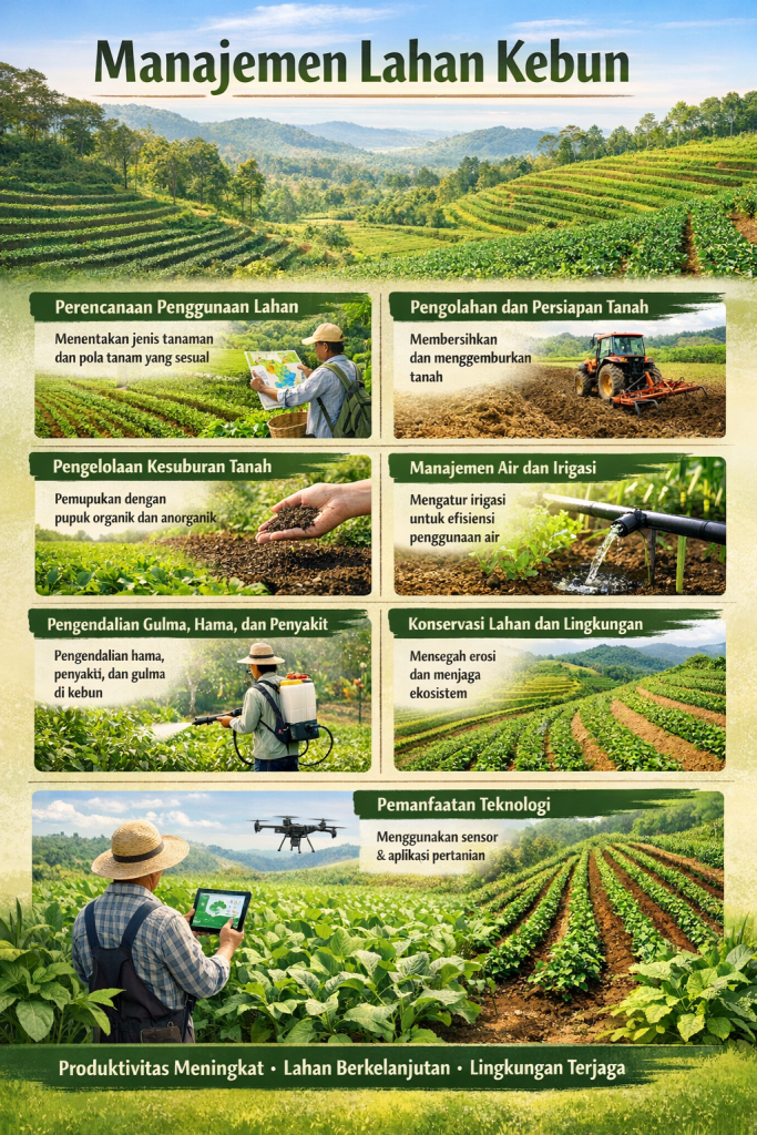 Manajemen lahan kebun merupakan aspek penting dalam kegiatan pertanian dan perkebunan yang mencakup perencanaan, pengolahan tanah, pengelolaan air, pemupukan, pengendalian hama, serta konservasi lingkungan. Dengan menerapkan manajemen lahan kebun yang baik dan berkelanjutan, produktivitas tanaman dapat ditingkatkan, kualitas lingkungan tetap terjaga, dan kesejahteraan petani maupun pelaku usaha perkebunan dapat meningkat secara berkelanjutan.